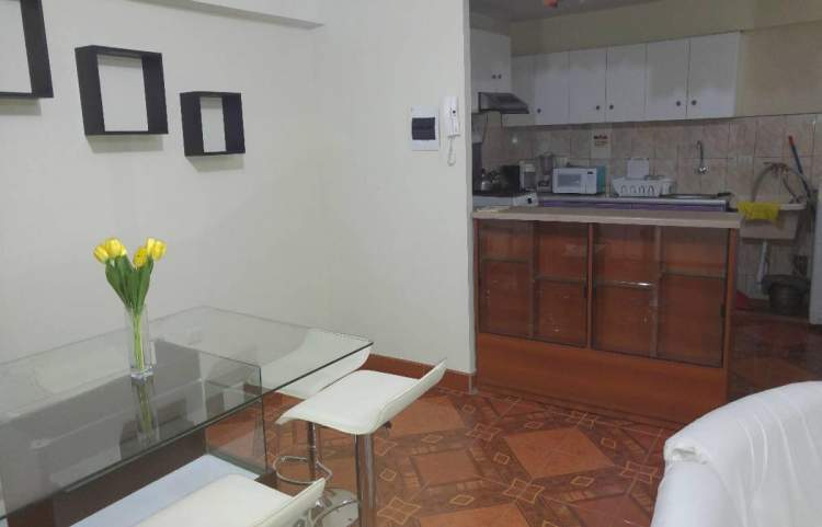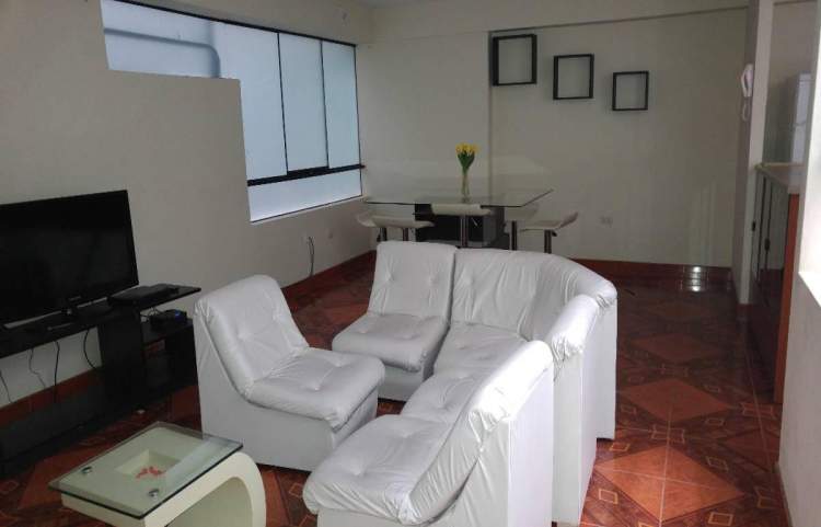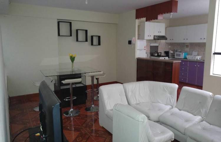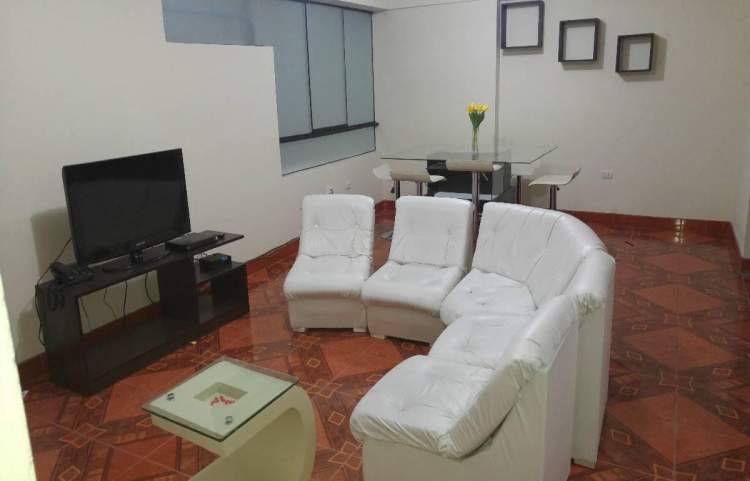Departamento en segundo piso, con 3 habitaciones, dos baños y una sala, comedor, terraza, cocineta, tiene roperos empotrados, cuenta con cuatro camas, colchones hoteleros cisne premium, frazadas, cobertores casatex y esta completamente amoblado y equipado con 03 televisores, DVD, cocina, refrigeradora, lavadora, microondas, licuadora, extractora, cafetera, olla arrocera, cuenta con ollas, cubiertos, platos tasas y cubiertos en media docena, ubicado en zona corporativa y financiera, zona residenc