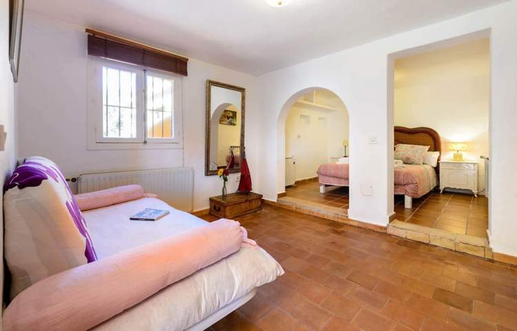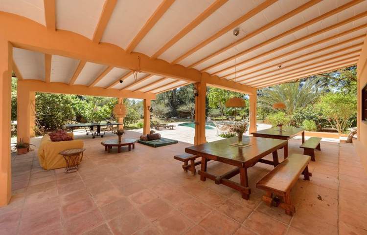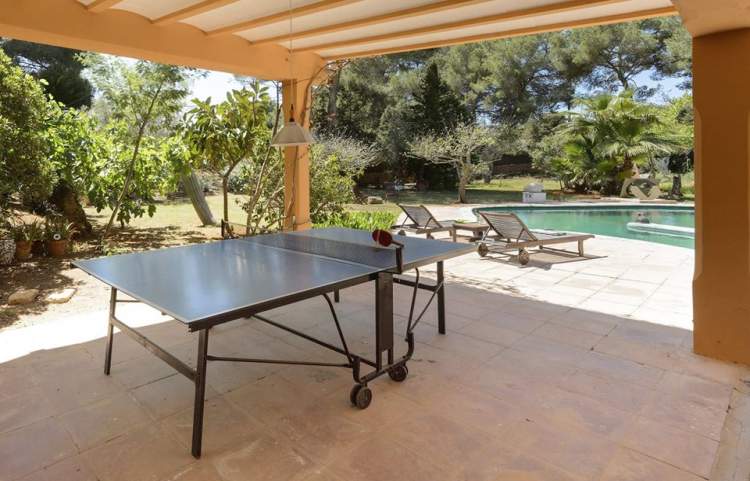 Esta es una gran villa cerca de Santa Eularia con capacidad para 12 p. y niños de ser necesario. Enorme salón de 80m2 es perfecto para actividades grupales. Hay 3 dormitorios arriba con aire acondicionado y 3 abajo con ventiladores. 4 baños, 2 aseos, dos salas de estar grandes, una gran terraza con mesas y asientos para 20 personas, una cocina de apoyo al aire libre con bebidas, nevera, etc., piscina, mesa de ping pong y espacios de jardín y chill-outs.