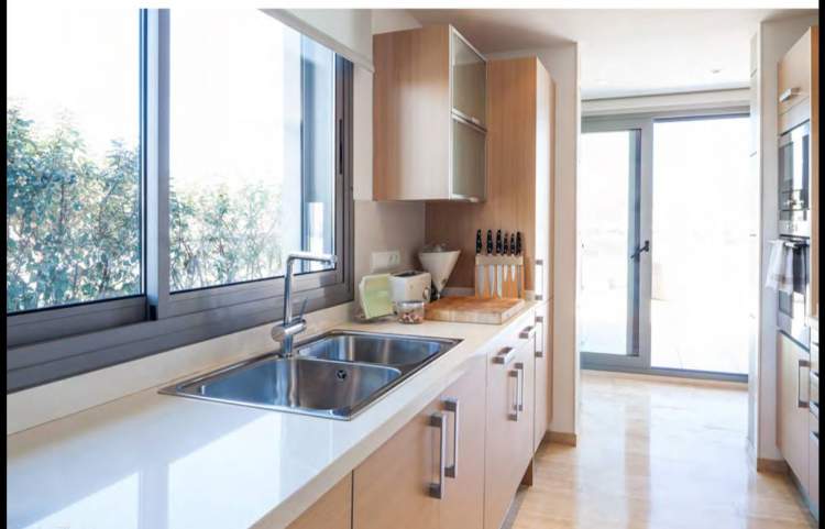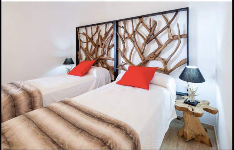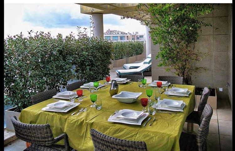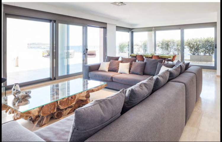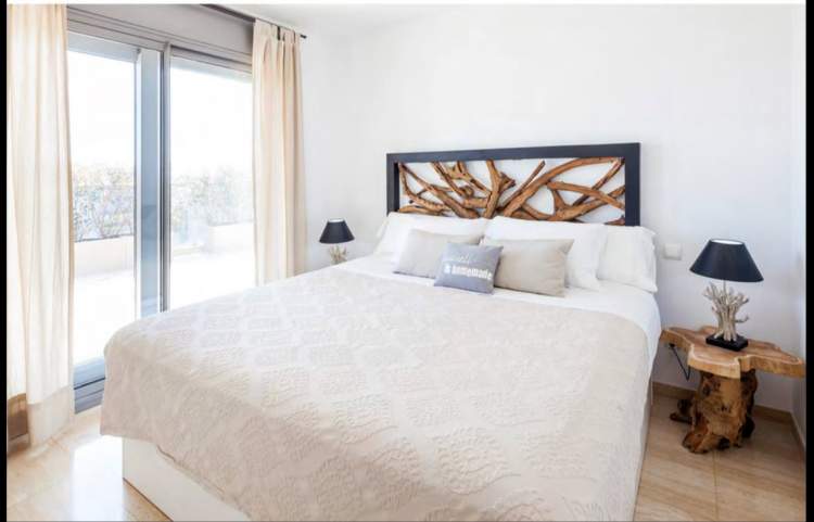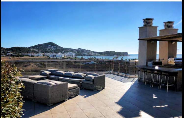 Piso con vista a playa de Talamanca y castillo de Evissa. Perfecto para familia o 3 parejas de amigos. 1 Master con cama king size, baño en suite con jacuzzi y ducha 2 Habitación King size o gemelas con baño al aire libre 1 Baño diario 1 Cocina totalmente equipada BBQ & Bar Wifi TV y música 5 Área de salón exterior Lavandería separada Terraza de 460 m2 2 estacionamiento en el interior Piscina privada reservada para los ocupantes del edificio. Seguridad y alarma