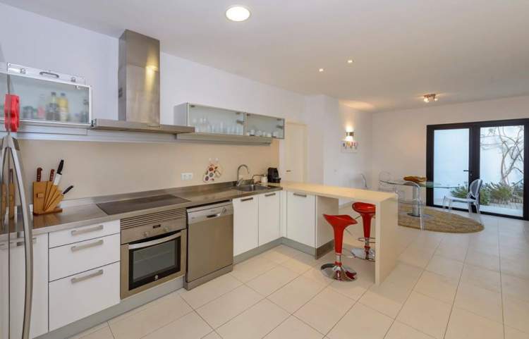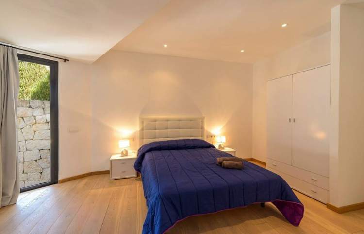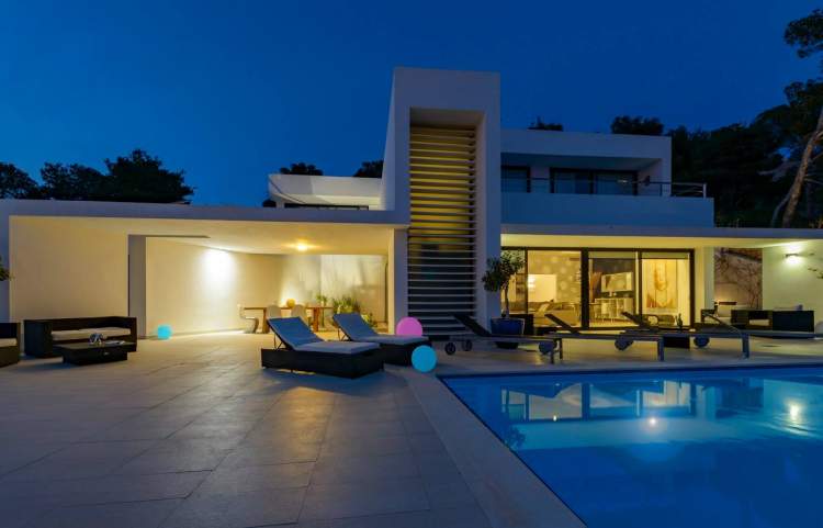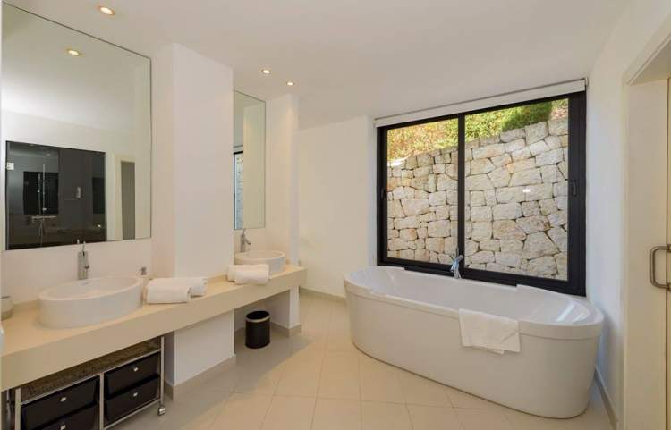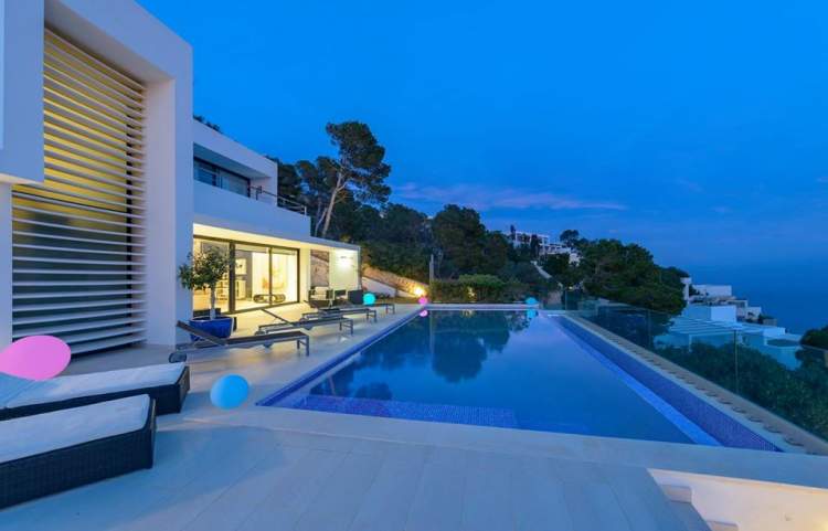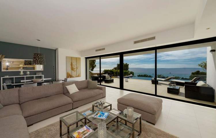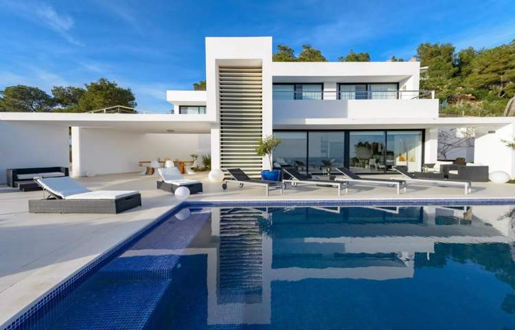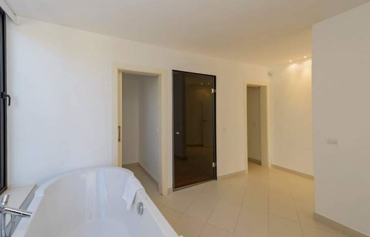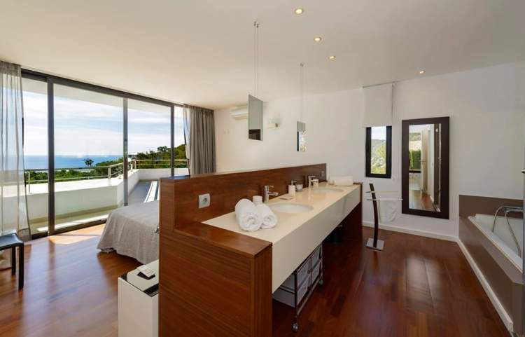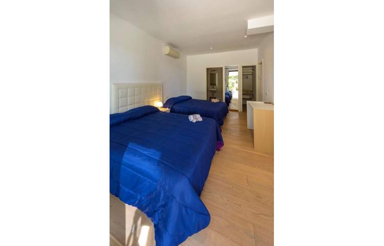 La villa consta de 6 habitaciones, cada una con su propio baño, ducha y bañera. Ingresa a la propiedad por una puerta en la que se encuentra un amplio garaje para 2/3 autos. Desde el garaje, puede utilizar un ascensor que le permite acceder al primer piso de la casa. En este, encontramos una gran sala de estar con sofás de alta calidad, mesa de comedor, acceso a la terraza con piscina infinita y vistas panorámicas del mar y Formentera.
